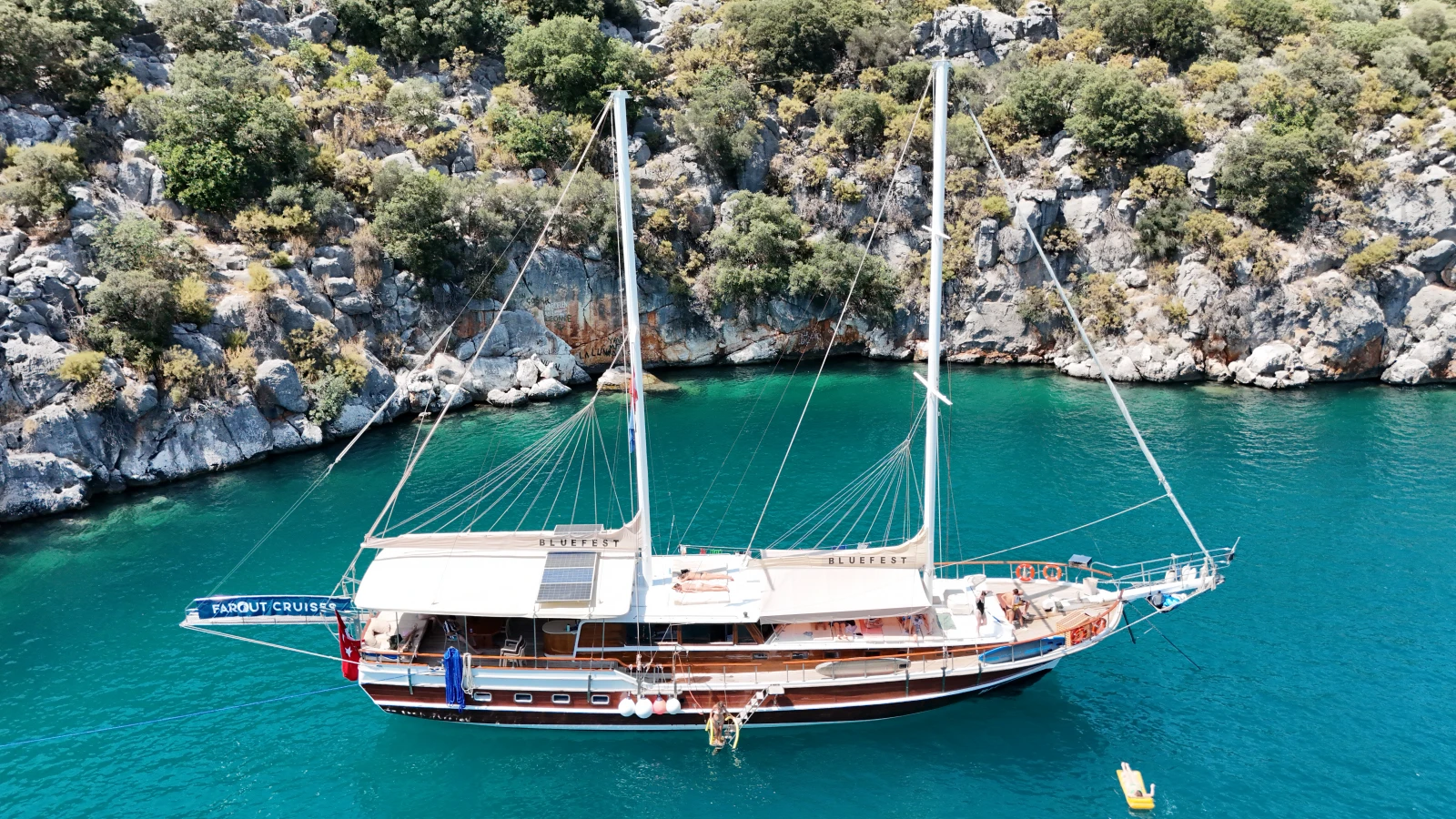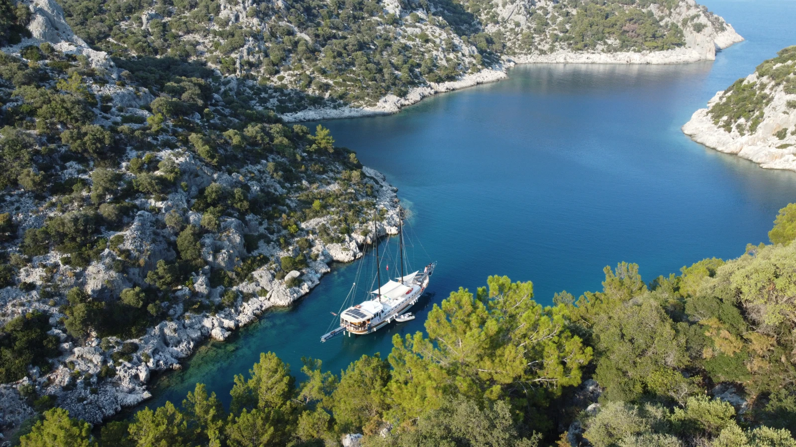 Gokkaya Bay is also the gateway to the lively Smugglers Inn Bar, a rustic open-air bar on a nearby island that can only be reached by boat. Here, you will have the opportunity to meet guests from our other gulets anchored in the bay. With a relaxed, bohemian atmosphere, music under the stars, and fellow sailors gathered from across the bay, it offers a memorable end to your day on Turkey’s Turquoise Coast. You are also welcome to stay on board your if you wish to have a quiet night.