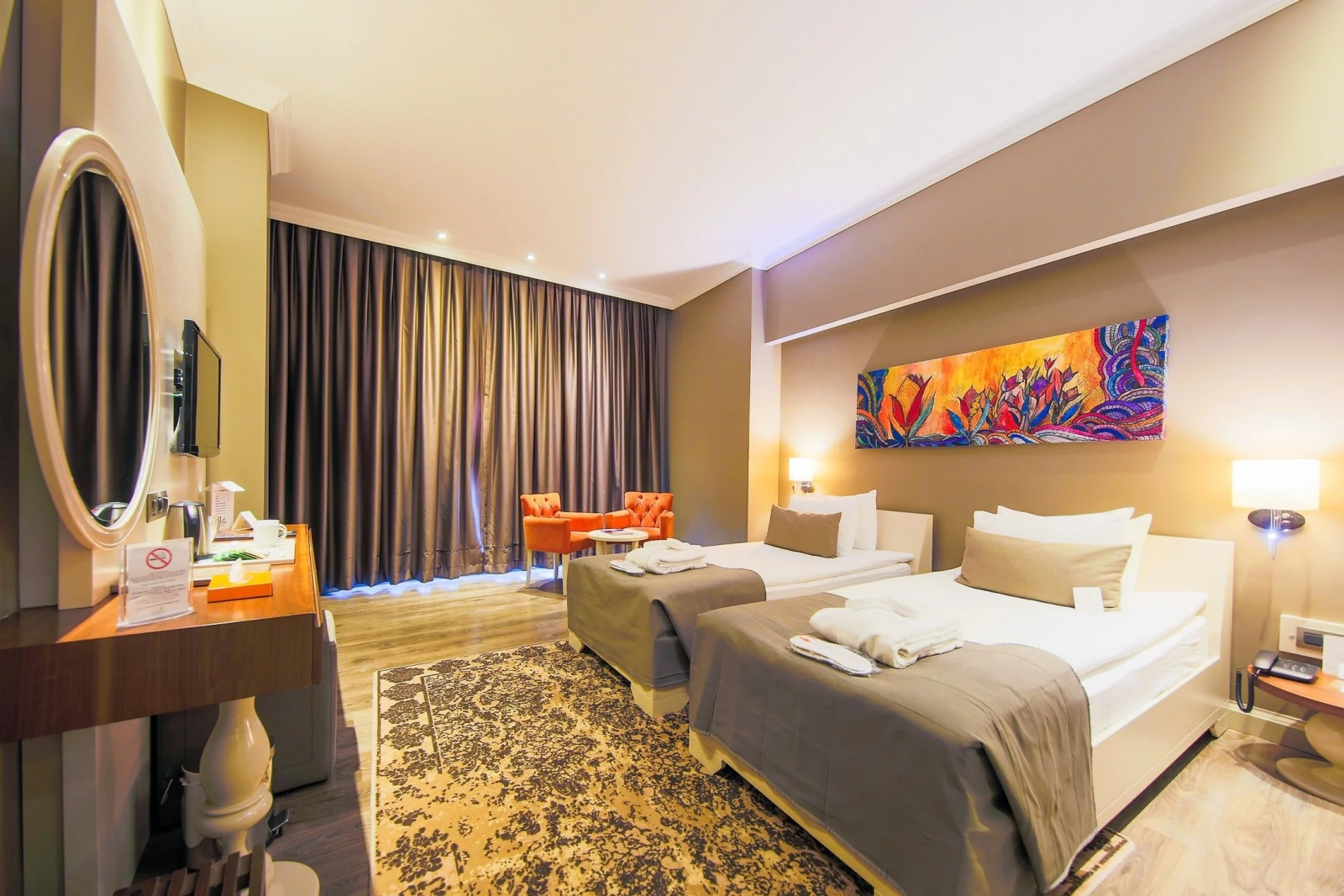 Doga Thermal Hotel offers a range of modern and luxurious rooms, Standard are equipped with bathroom, shower, writing desk and seating area, while Deluxe rooms are slightly larger. The hotel also offers suites with separate living and sleeping quarters or King apartments with an extra bathroom for guests and a bathtub with thermal water. Disabled access rooms are also available. All rooms come with modern amenities, daily housekeeping, room service, high-speed WiFi and more.