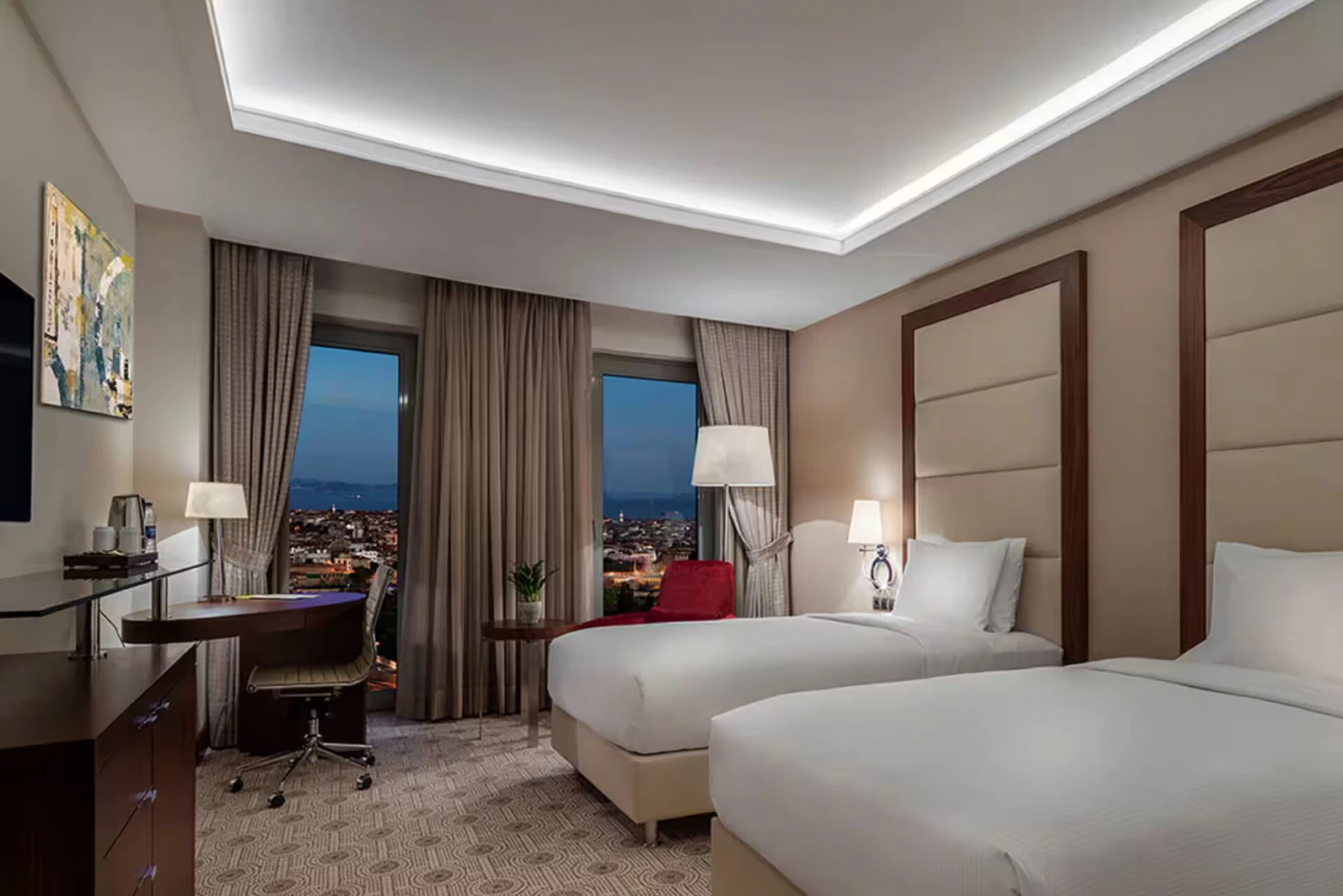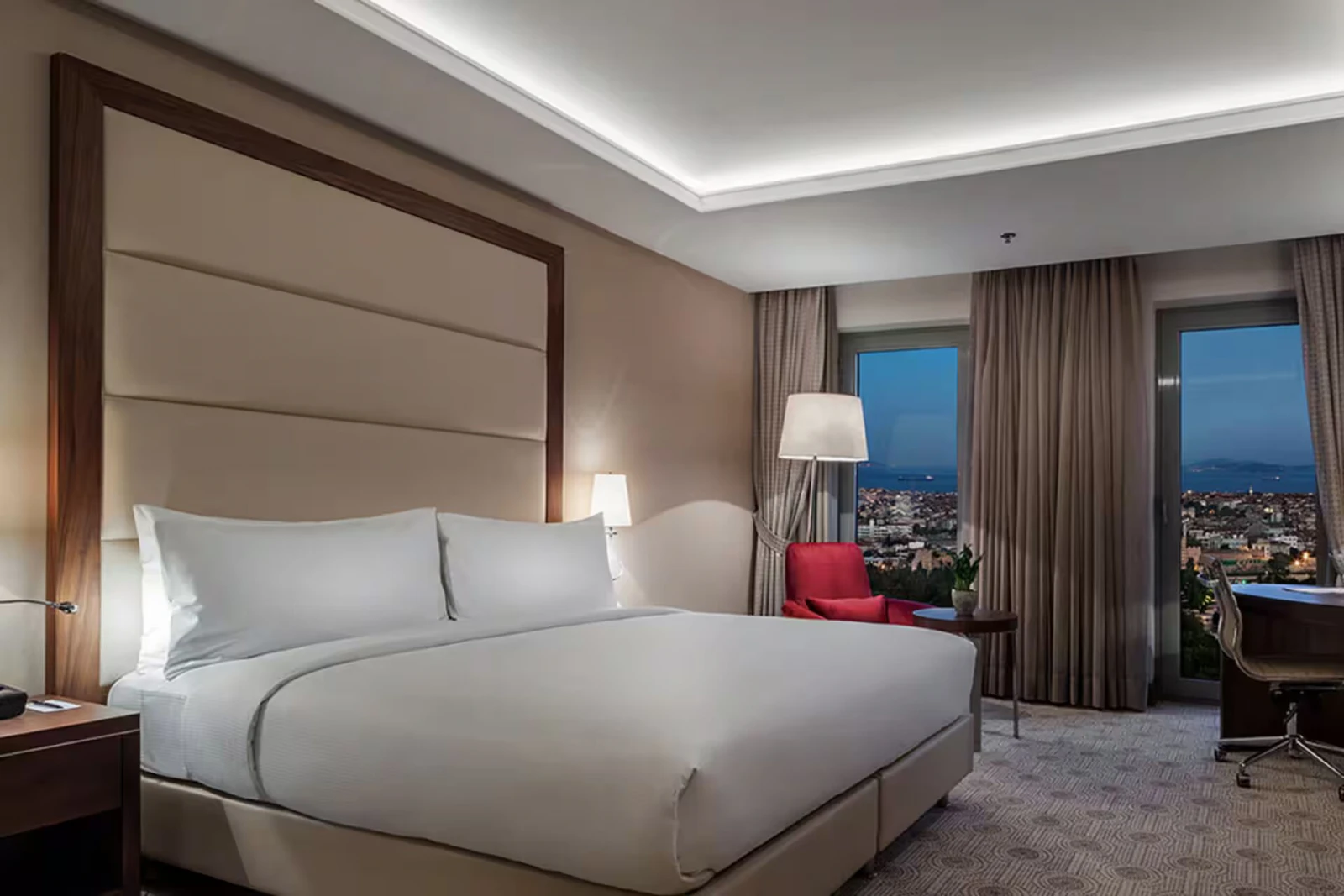All rooms in the hotel feature air-conditioning and free Wi-Fi, LCD TV with satellite channels, safety deposit box, tea and coffee, complimentary bottled water and minibar, as well as 24-hour room service. The rooms are very large, starting at 36sqm for a standard room, and offer stunning views over Istanbul city. Sea views are available on request. The presidential suites are a massive 205sqm with sea views. Double Tree Hilton Topkapi also offers family rooms, junior suites and king suites, and wheelchair accessible rooms are also available.